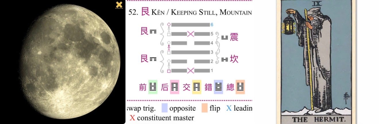 This is the foundational instruction, mirroring the I Ching’s Hexagram 52, “Keeping Still, Mountain.” It is the direct antidote to the fiery, impulsive, and potentially overwhelming energy of the Aries Moon square Jupiter and trine Mars. Before you can harness the fire, you must first find the void, the stillness within.“The ten thousand things rise and fall while the Self watches their return.”