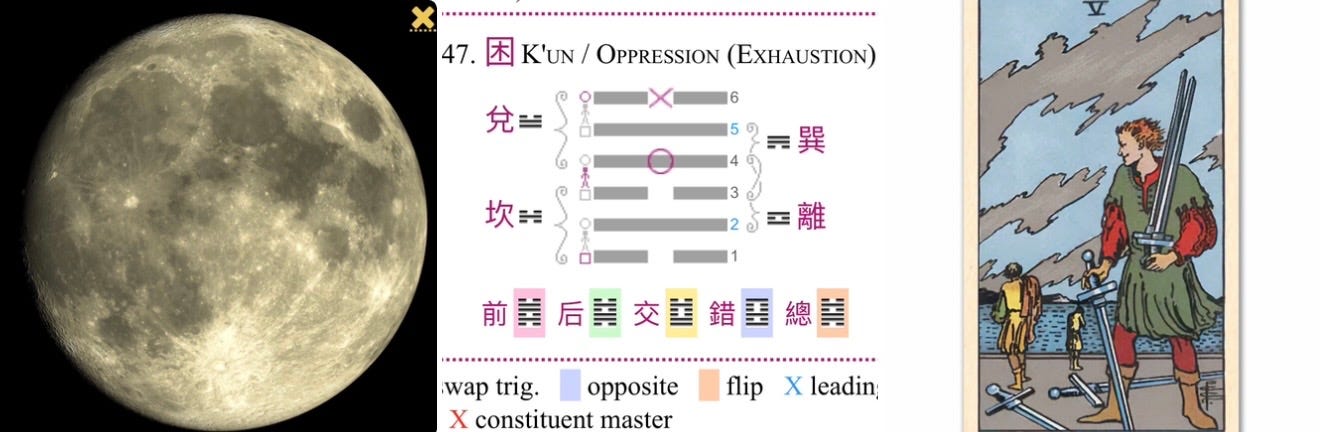 This is the final, stark warning. It is the very essence of the Five of Swords. If you allow the restless, chaotic energy to dominate, you will lose connection to your regenerative “root” (Scorpio Sun) and the inner “master” (your Higher Self, your inner stillness) will be lost. This leads directly to the defeat and exhaustion of Hexagram 47 (Oppression).
