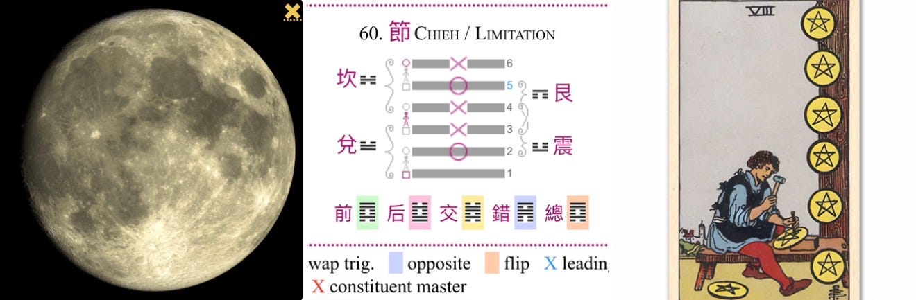 You begin with Hexagram 60, Limitation. This is the container, the structure, the Saturnian discipline. It is the necessary phase of darkness and containment where potential is gathered and shaped. It is the crucible.