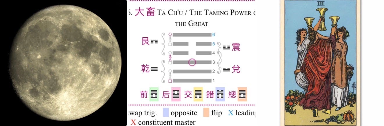 Hexagram 26 - The Taming Power of the Great: This is the primary task. You are filled with a great deal of mental and emotional energy (the two opposing rivers). The hexagram advises that this power must be tamed and accumulated, not recklessly discharged. It is a call to hold your potential in reserve, to study the past, and to build your inner character.