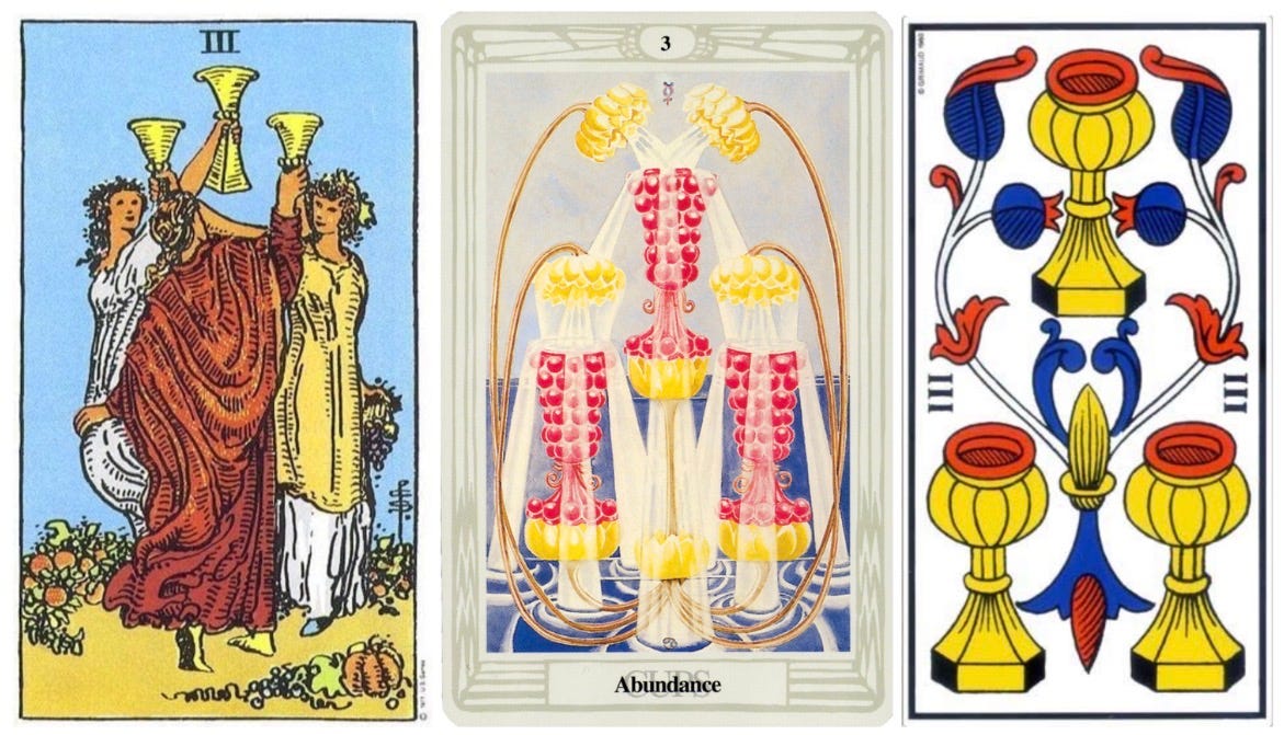 In a day that threatens irritation and conflict, the Tarot offers the radical solution of joyous communion. The Three of Cups depicts three figures raising their cups in a shared celebration of emotional abundance and friendship.