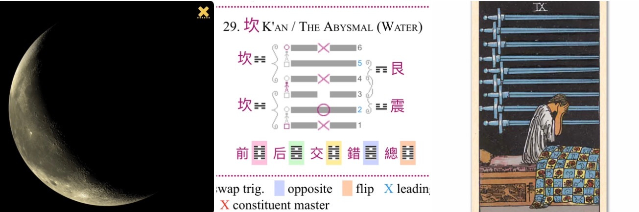 The energy of this day is intense, weighty, and transformative. It is not a time for lightness or superficiality. We are being presented with a profound challenge that operates on both the emotional and intellectual planes. The central theme is a confrontation with a difficult reality, forcing a purification of thought and action. The combination of the Nine of Swords, the Moon-Saturn opposition, and Hexagram 29 (The Abysmal) paints a clear picture: we are in a mental and emotional pit, and the only way out is through sincerity, discipline, and unflinching honesty.