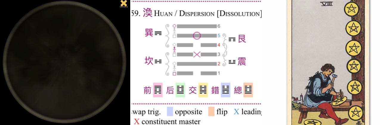 Hexagram 59 - Dispersion (Dissolution): This is the primary process of the day and the season. The ice is melting. Old, rigid structures (both internal and external) are dissolving. The hexagram advises using this energy to dissolve the egoic separations in our own hearts and to build spiritual unity.